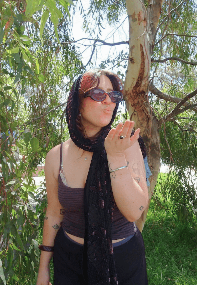 My second look leans into a little pattern play, with a purple striped singlet and a purple-pink accented bra; because festival season is the time to experiment with looks you might not wear to your cousin’s wedding. I paired it with a comfy, flowy black skirt that has just enough bejewelled embellishment to feel festival-appropriate, and I threw on my favourite op shop scarf for some extra zing. More purple, a little velvet and crucially… sun coverage for my head!
