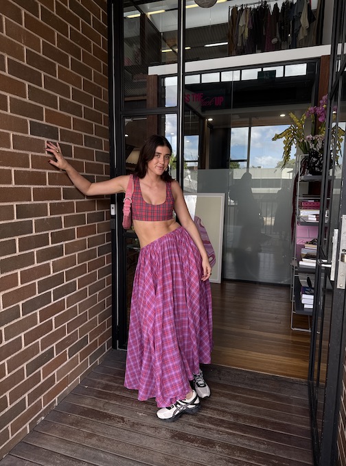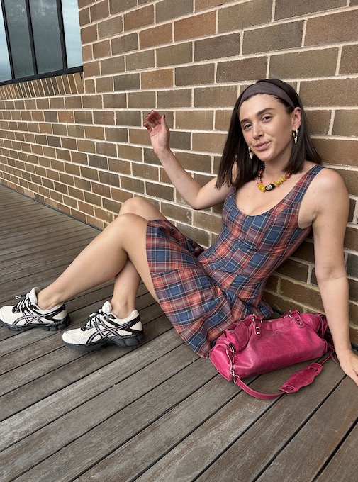 For an overcast day spent in her Sydney office, Katie chose her Annabel Maxi in dusty rose plaid. “It perfectly matched the soft pink tones of my GEL-CUMULUS 16s,” she says. “I love mixing prints, textures, and unexpected pairings – just like a sneaker and dress combo! I paired this look with my big chunky pink sunnies and a vintage pink leopard bag for a fun clash of prints.”