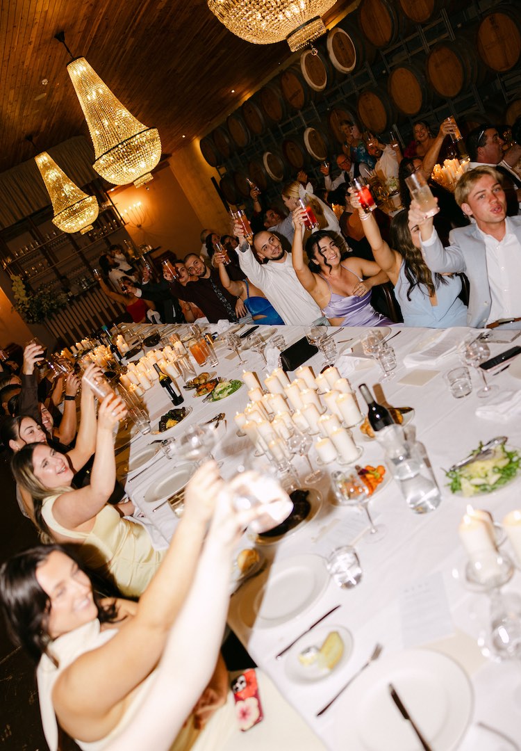 The Sienna has a stunning grand hall called Gigi’s on-site. The totally over-the-top chandeliers and wine barrels were what sold us. We had our beautiful florist and stylists, Lily and Mae, dress our tables with candles and had our food served for everyone to share. We wanted it to feel like a big dinner party where the conversations and food were flowing. We wrote handwritten notes to each guest as our place cards, which felt like a lovely way to show our appreciation for them being a part of our lives. Some of our guests have framed them, which is so sweet.