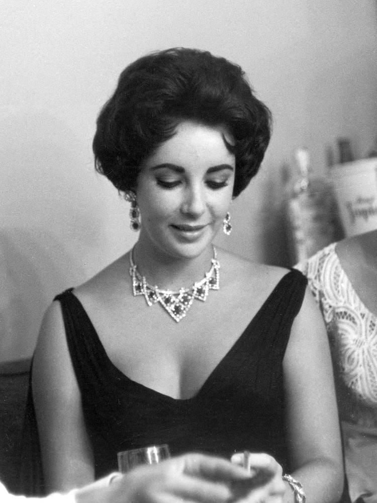 The exhibition includes a 1951 necklace gifted to Elizabeth Taylor by her third husband and film producer, Mike Todd, while on holiday in the French Riviera in 1957. The necklace features a geometric latticework design of diamonds that showcase seven Burmese rubies, exceptional for their size and matching colour. Taylor herself described the necklace as ‘like the sun – lit up and made of red fire.’