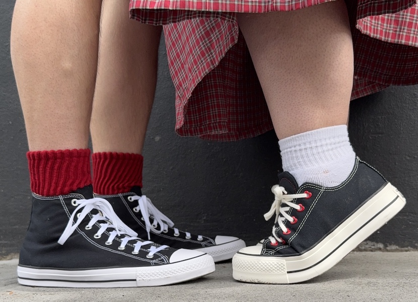 For Hannah’s date-night look, Otis chose the Chuck Taylor All Star Lift Lows from the Converse Valentine’s Day collection, paired with a cropped white T-shirt and ’90s-style maxi skirt. “I chose tartan to mix with the white shirt, and socks to pull the red of the Converse in. I love the look of platform sneakers with a flowy skirt, which is a staple in Hannah’s wardrobe,” he explains.