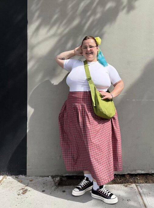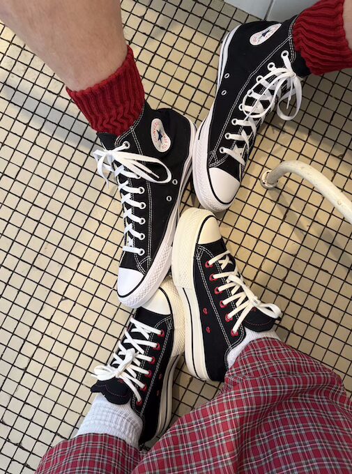 For Oscar, Hannah chose a pair of classic black Chuck Taylor All Star High Tops, paired with shorts and red socks. “The shorts are some thrifted AMCO ones I got a long time ago, which are hemmed to be a bit shorter,” she says. “I love the ’80s summer vibes of short-shorts and a singlet tucked in. The socks are actually mine… I love the classic Chucks with a splash of Valentine’s Day red.”