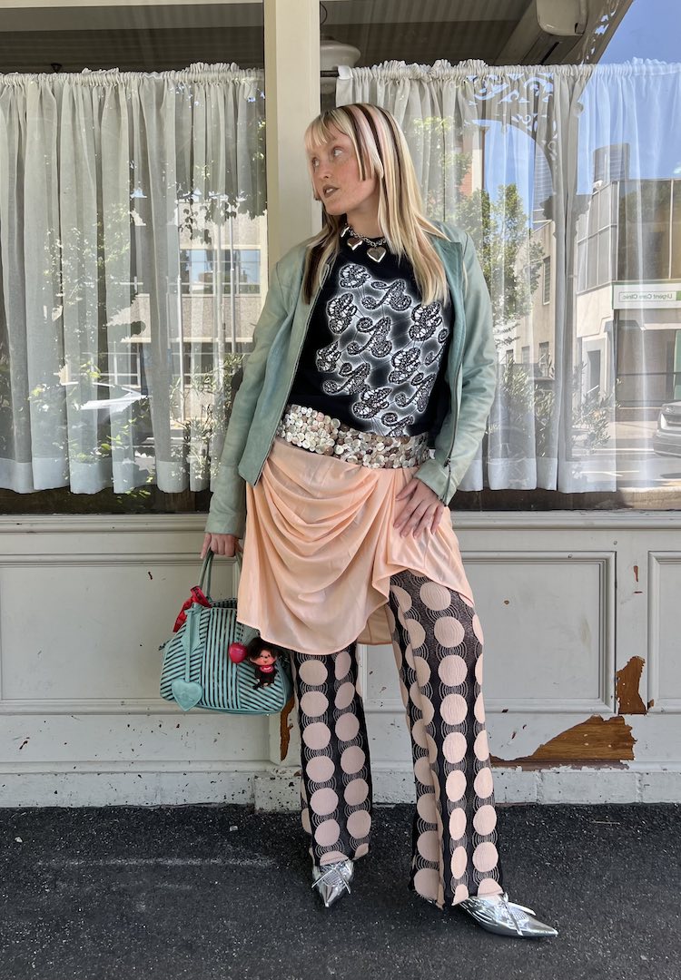 If I had a colour combination of the year, it would be sea-foam green with peachy pink. In my outfit above, I’ve paired my favourite Vivienne Westwood handbag and vintage leather jacket with a vintage slip dress in a perfect peach colour. And my Cakey Sportsman pants and Suku button belt compliment the colours perfectly. I suspect my obsession with this colour combination will continue into 2026.