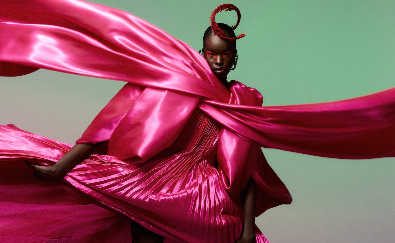 COMME DES GARÇONS cardigan from BRUCE, VALENTINA BARRIOS cape (worn as skirt), MILLINERY JILL headpiece, DINOSAUR DESIGNS earrings and ring, stylist’s own shoes gloves and hosiery