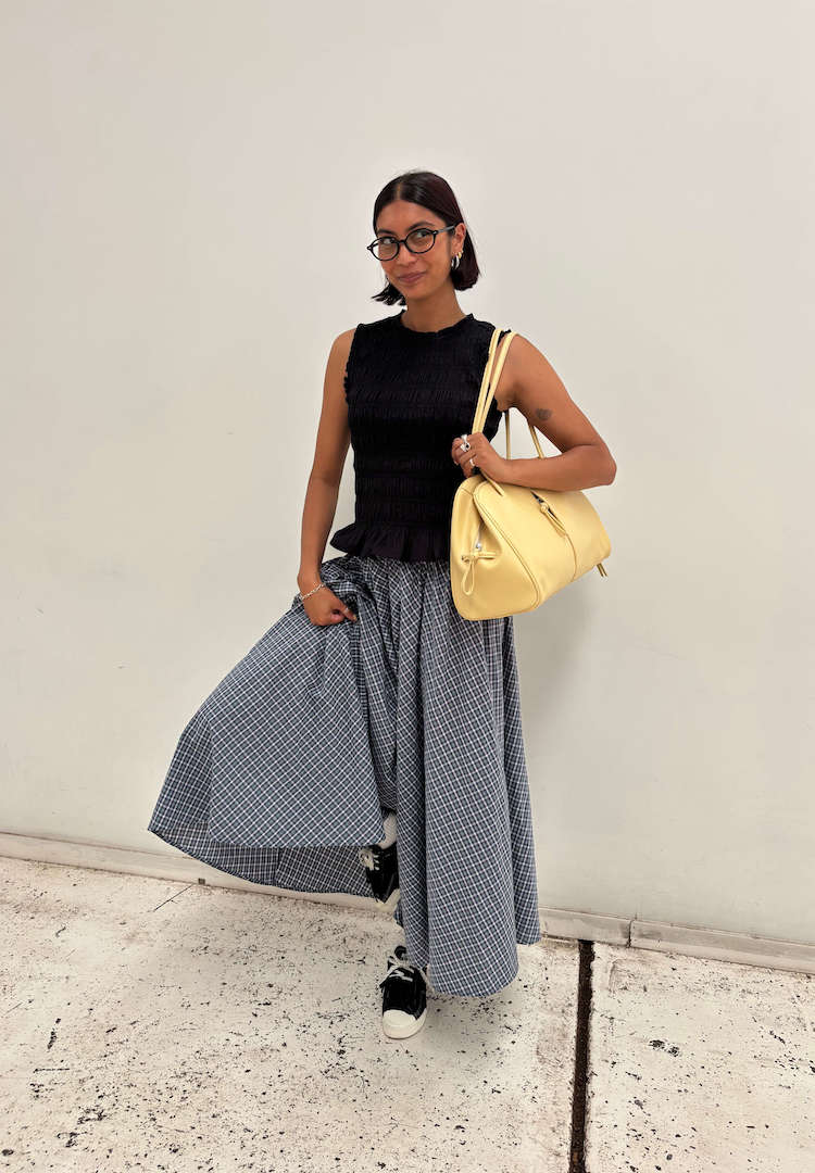 “I feel like this outfit is the perfect mix of sporty and feminine,” says Ashley. “Pairing sneakers and a maxi skirt is such a good way to dress down an outfit for the office – especially when you work in an office like mine. Monday also means pizza and date night after work, and this combo is perfect for moving from desk to dinner.”