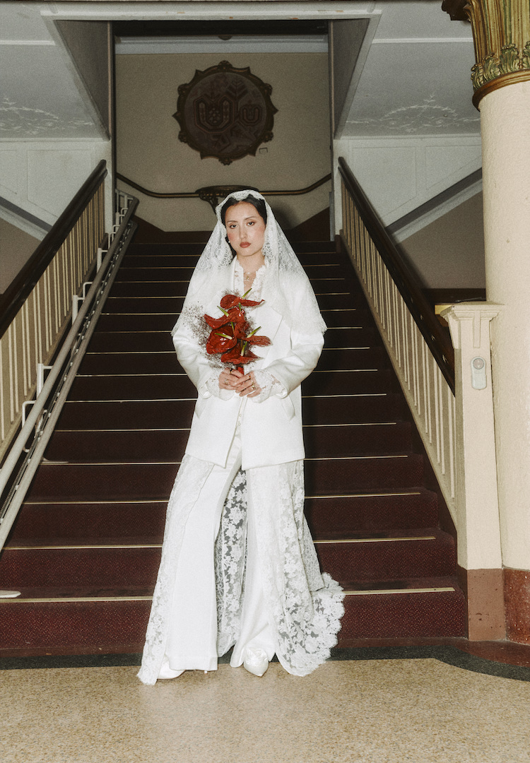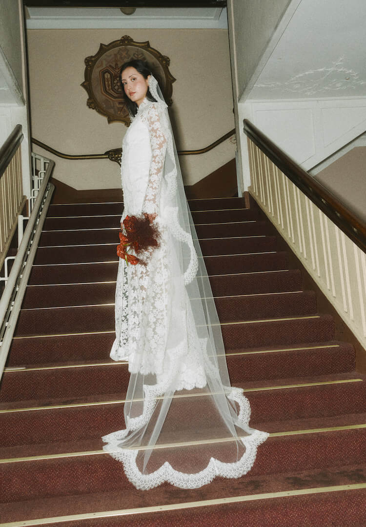 For brides ready to go all-in on the dramatic aesthetic, look no further than the Stevie dress, an elaborate, high-necked showpiece gown made for layering. Cut in sheer lace with pearl buttons running down to the thigh and a subtle train, the dress has all the elements of a gothic novel heroine’s gown. Just imagine running across the foggy moors in it.