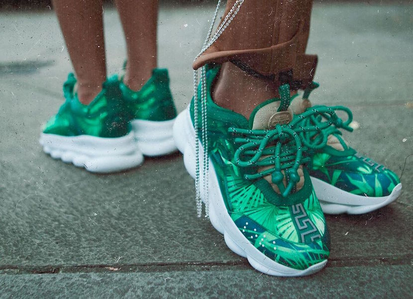 Available in both men’s and women’s sizes, the shoe includes a chunky, graphic white sole and patterned laces. Other branded touches include a Versace Medusa head on the heels, Greek-inspired detailing and braille characters spelling ‘love’ on the toe.