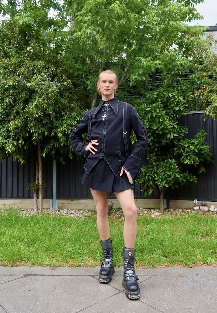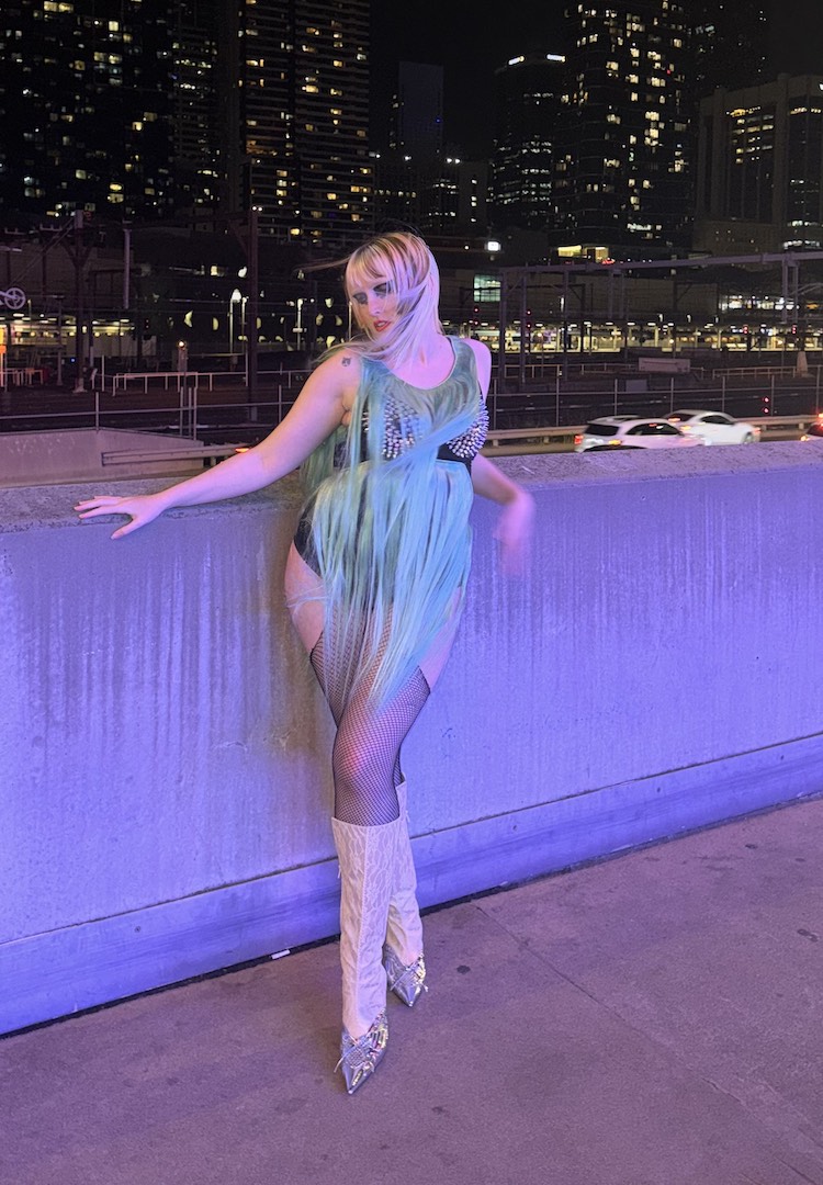 Colour and texture are what I usually lean into day-to-day, but for a Gaga concert I like to take both ideas up a notch. Most of my pieces are thrifted. The top is from an op shop and the skirt was originally a dress that I cropped into a skirt. The tights came from a stash owned by an iconic older diva who had kept them brand new for years, and the collar is a ’70s placket cover that I added ties to so it could work as a neckpiece.