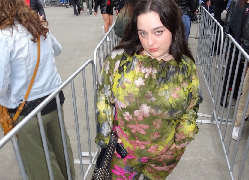 Colour and texture are what I usually lean into day-to-day, but for a Gaga concert I like to take both ideas up a notch. Most of my pieces are thrifted. The top is from an op shop and the skirt was originally a dress that I cropped into a skirt. The tights came from a stash owned by an iconic older diva who had kept them brand new for years, and the collar is a ’70s placket cover that I added ties to so it could work as a neckpiece.