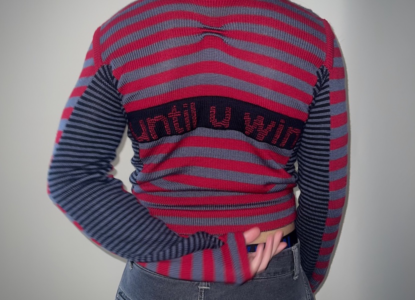 It’s like cyber coquette meets deconstructed sport fetish. I pull a lot of visual inspiration from old video game avatars and early internet aesthetics, and channel this into intimate, body-hugging knitwear.