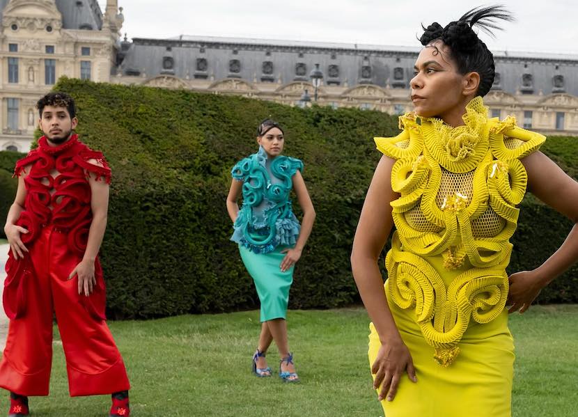 Creating her Liberty collection took a considerable amount of time, with most of the fabrics custom-dyed in-house and constructed using traditional ‘grasshopper’ weaving techniques – a practice unique to her Torres Strait heritage, which she describes as “meditative”.