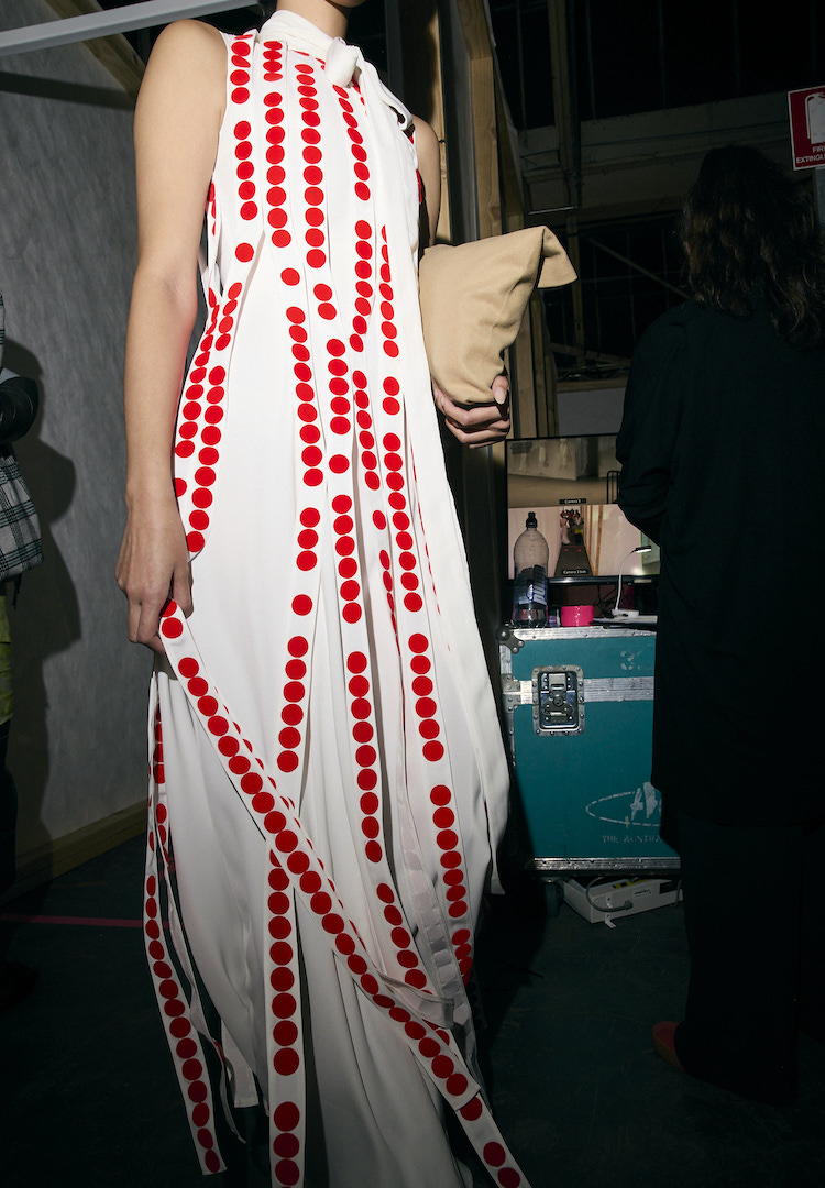 Elements of upcycling are always present at a student fashion show but this cohort’s use of reworked junk (for lack of a better word) felt particularly fun. Think items you’d find at a mechanics or in the office stationary cupboard: car number plates redesigned into a handbag, a motorcycle helmet reimagined with sexy black fringing, a giant bulldog clip bag and a dress adorned with strips of red dot stickers.