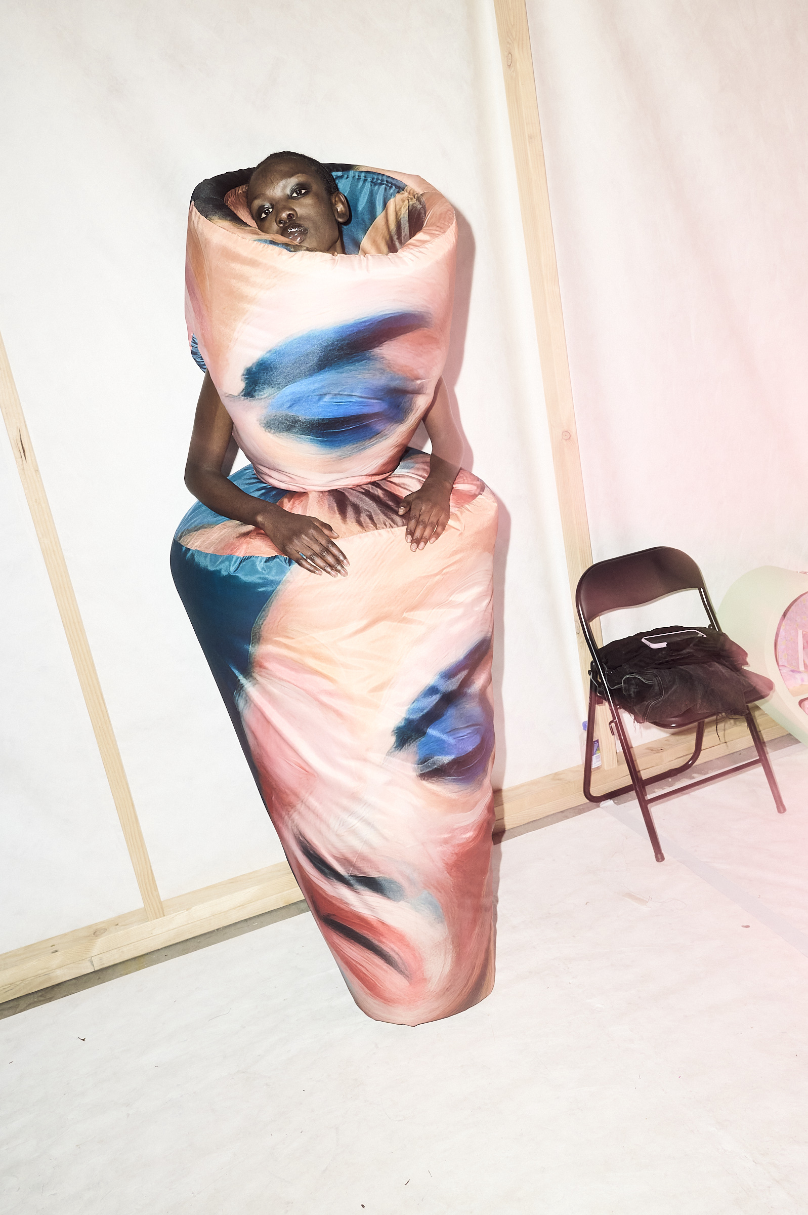 Another student who sent imposing shapes down the runway was Margaret Hogan from LCI, whose sculptural vases fully contained the statuesque models in matching bodices underneath. LCI student Valentina Barrios‘ collection was inspired by furniture design, resulting in dramatic looks that merged velour evening gowns with wearable foam headrests (they did look comfy).