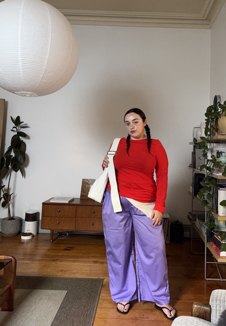 I’ve always been fond of a boob tube layered over another top, so when I spotted this grey St. Agni boob tube-dress-hybrid at their Melbourne archive sale, I knew it would be a piece I’d get a heap of wear out of. The pants are also St. Agni and I’ve been thrashing them lately. The cut is impeccable and they have an adjustable waistband. My black tee is from New Zealand brand Buddy, and I always wear it backwards so I get the boatneck, ’90s neckline (I do this with most my tops). And thongs are from Twoobs – I work in women’s media, and thongs are A-okay in our office!