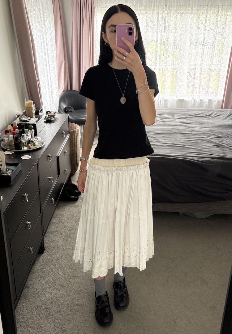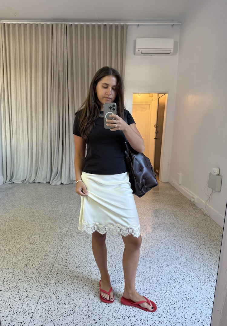 I’m a pants and jeans girl through and through, but when it’s hot, I’ll happily swap them out for a midi skirt. On this day, I wore an old T-shirt from Bassike, a white slip skirt from With Consideration and a beaded necklace from Baac Studios.