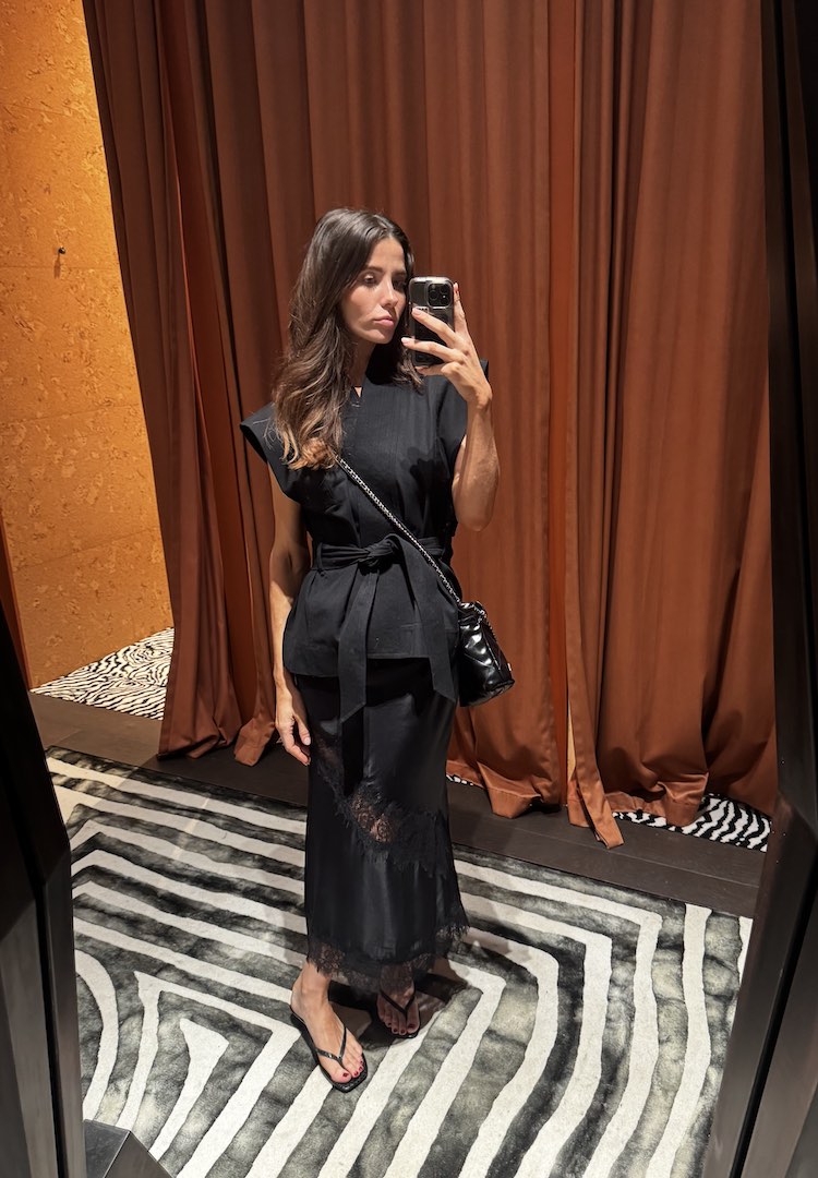 My schedule is busy and varied, and I need outfits that are versatile. My go-to is our Maison Essentiele Kimono top with our Silk Lace midi skirt or classic denim for a look that works from desk to dinner.