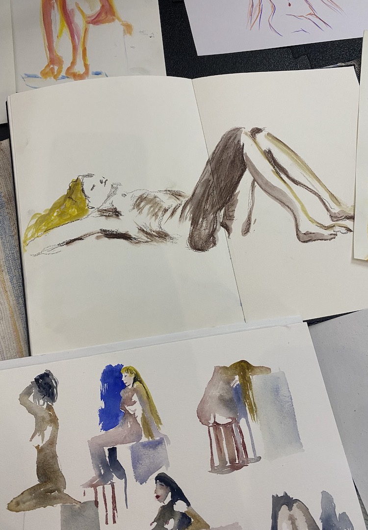 At the end of the session, we asked the artists to put their drawings from the session onto the mattress we had been posing on. I asked one man if I could have one of his watercolours of me. Later, I looked him up. Three of his oil painting portraits hang in the National Portrait Gallery in England.