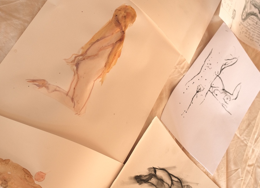 Soft, never-ending harp music played on a UE Boom tucked away somewhere. This sound was layered with fingers brushing eraser crumbs away and softening carbon marks on paper as I sat still on a chair draped in white bedsheets.