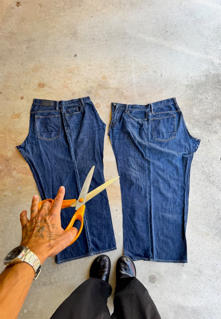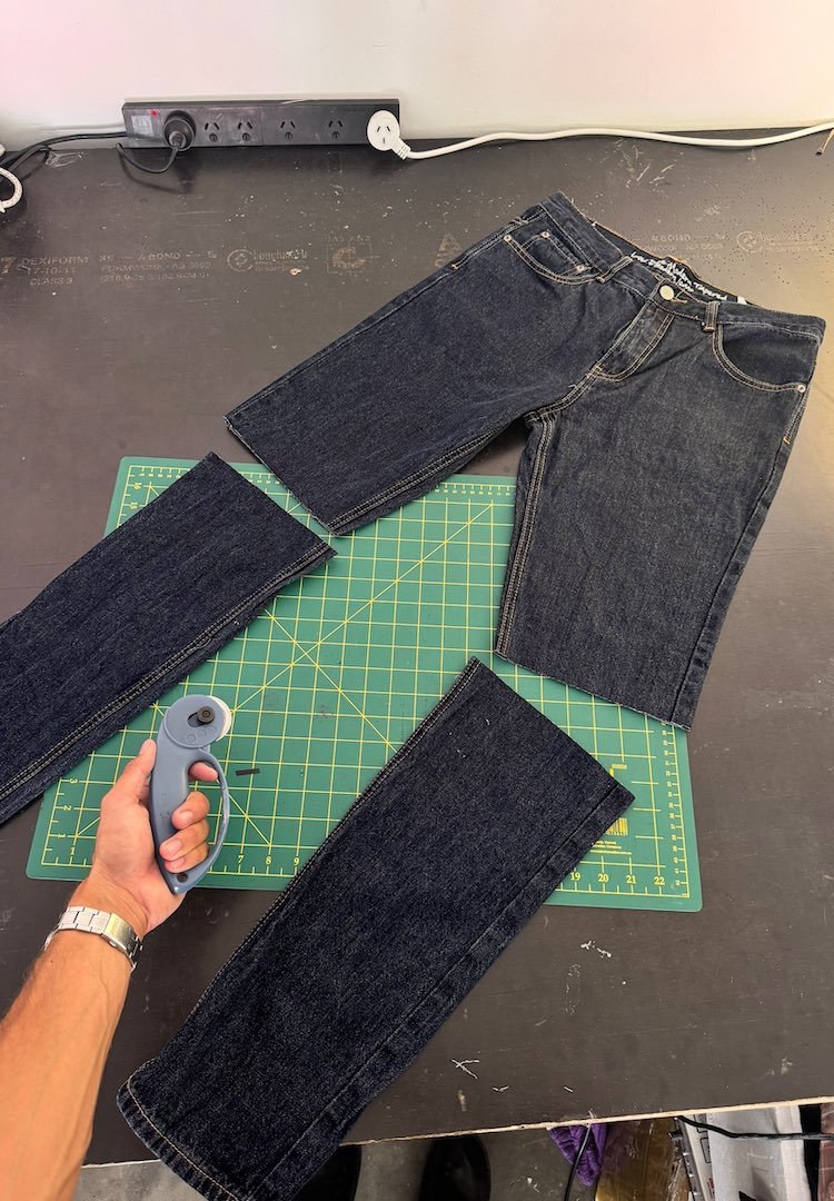 Once the length is marked, I cut both legs using a rotary blade. Scissors work fine too but the blade gives a straighter line. I line up the legs so the cuts match and slice just above the mark. This is the moment the jeans basically stop being jeans and start turning into the new shape.