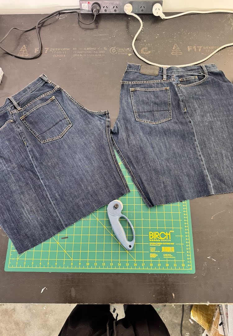 I started with two pairs of indigo jeans, both around a size 30. I found them super cheap at my local op shop. I try to pick dark denim because it blends nicer once everything gets cut up. Laying them flat helps me see the shapes and decide which pair will be the base and which one I will chop up for panels. Nothing fancy, just simple sourcing before the fun starts.