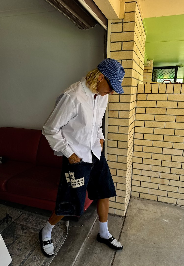 If there’s one person on my FYP right now who might actually convince me to take a pair of scissors and some thread to my jeans, it’s Fletcher Kiley. Having amassed a following of almost 20,000 people on TikTok, the Australian-based sewer’s feed is full of upcycled creations. Think panelled jeans, patchwork shirts, cut-out tops with white lace and caps for his upcoming label, Caroline Fifteen.