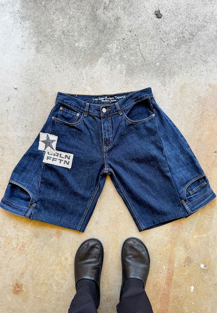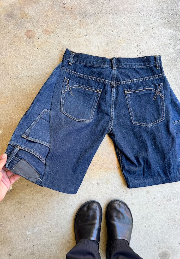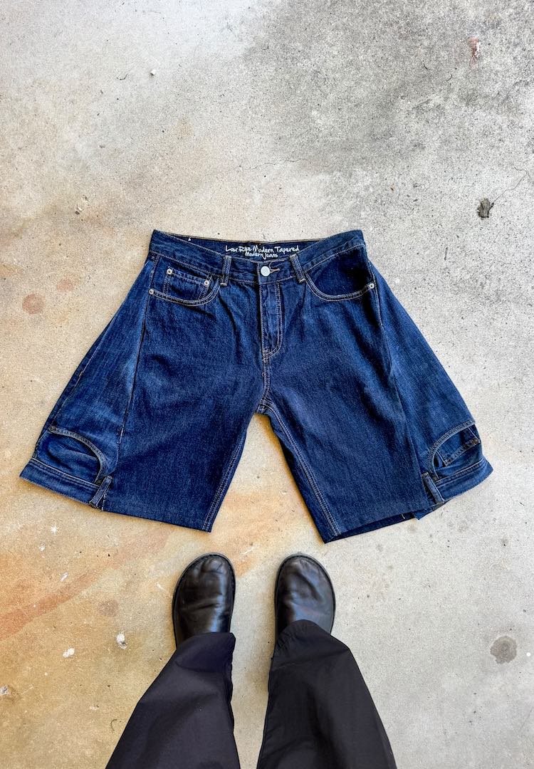 Now the shorts have their real shape. The pockets from the donor jeans end up lower on the sides which gives them a nice custom feel. The inverted panels give the shorts that balloon style that is super comfortable. At this stage I just check that both sides match and the hems sit even.