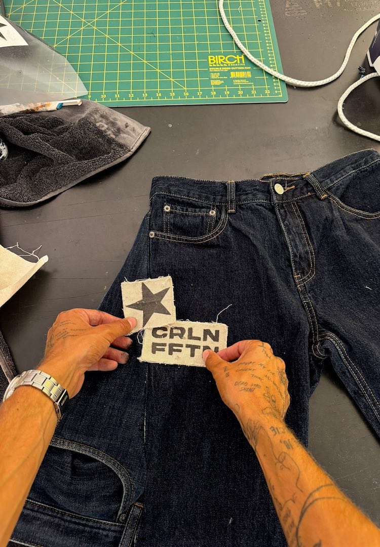 To add a bit more personality, I make distressed linen patches. I’m going for a light Y2K feel so I rough up the edges by hand and let them fray naturally. I use old stencils from my brand, Caroline Fifteen. I spray black paint through the stencils which gives the patches that imperfect, handmade look. They are quick to make and add nice texture.