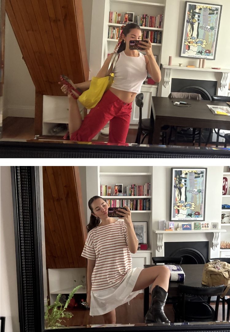 Aside from fabrics, there were few other patterns that quickly emerged: I feel best in low- to mid-rise waists and exposed midriffs, mini and midi length bottoms, and low-profile sandals. I gravitate to pale pinks, blues, greens, white and red in particular, and I wear a lot of fun prints.
